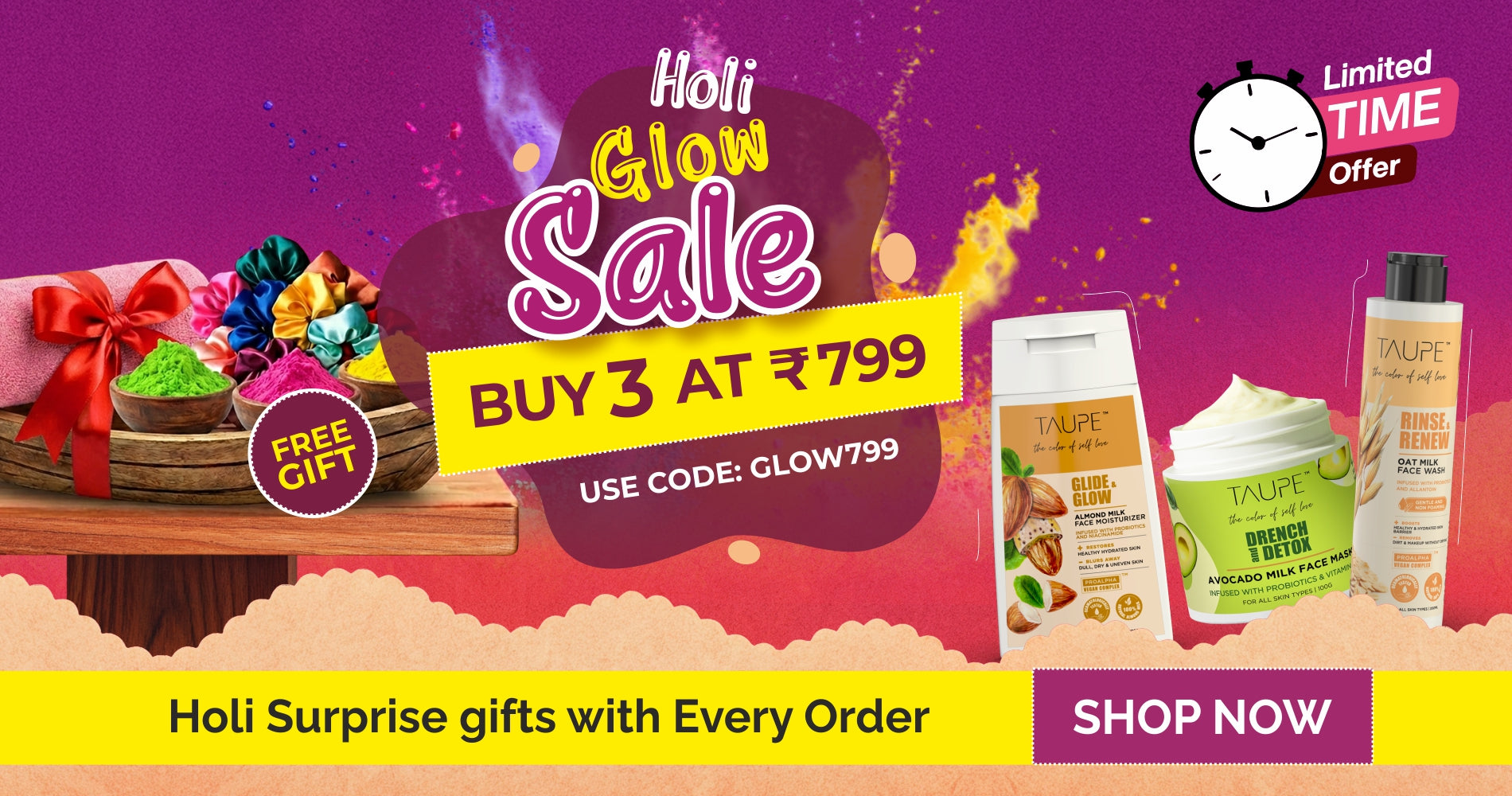 Holi Glow KitHoli means bright colors, long hours in the sun, and a lot of fun. But all those colors can leave your skin dry, irritated, and dull. That’s why this kit takes care of your skin before and after you play. Oat Milk Face Wash cleans your skin gently before Holi so colors don’t stick to dirt or dryness, and after the celebrations, it helps wash off stubborn color without making your skin feel tight. Avocado Milk Face Mask keeps your skin soft and strong before you step out, and later soothes and hydrates it once the colors are gone. Coconut Milk Sunscreen protects your skin from harsh sunlight while you enjoy every splash of color. Simple care for colorful days. And that’s not all. This kit also includes surprise gifts like a scrunchie, a premium towel, and organic color to make your Holi even more special.For All Skin Types(SAVE 51%)₹1,199₹599 -